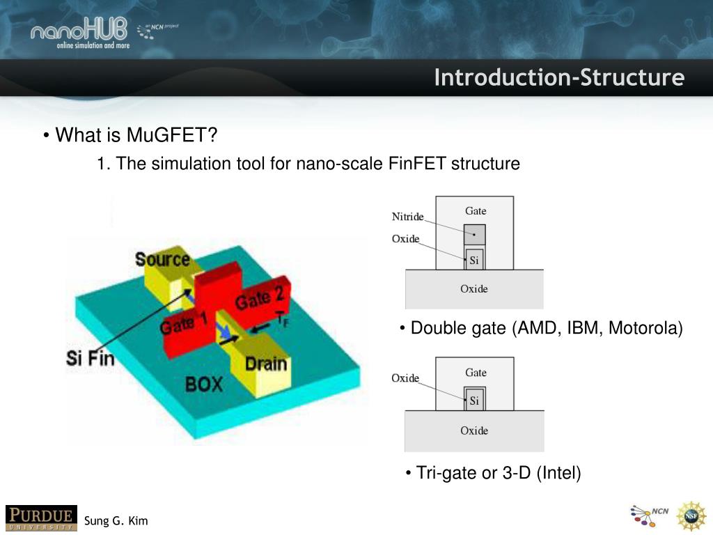 MuGFET. First Time User Guide to MuGFET Mar. 28, 2008. Overview. Introduction Rappture input interface Rappture output interface Summary. Introduction-Structure. What is MuGFET ?. 1. The simulation tool for nano -scale FinFET structure. Double gate (AMD, IBM, Motorola).