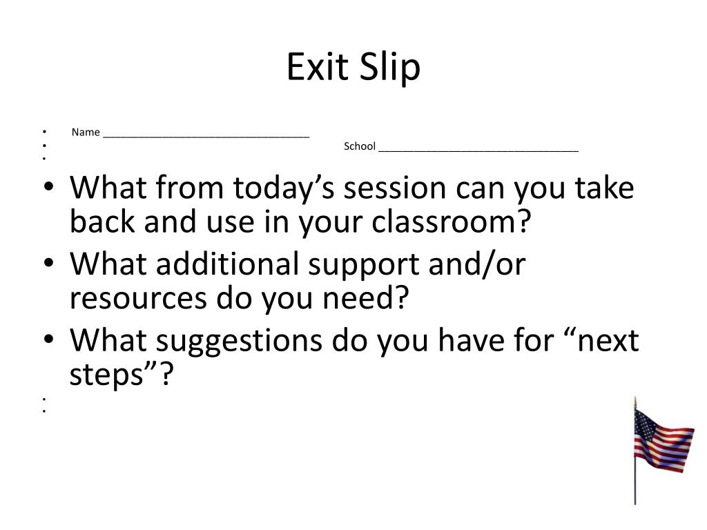 Exit Slip • Name ___________________________________ • School __________________________________ • What from today’s session can you take back and use in your classroom? • What additional support and/or resources do you need? • What suggestions do you have for “next steps”?