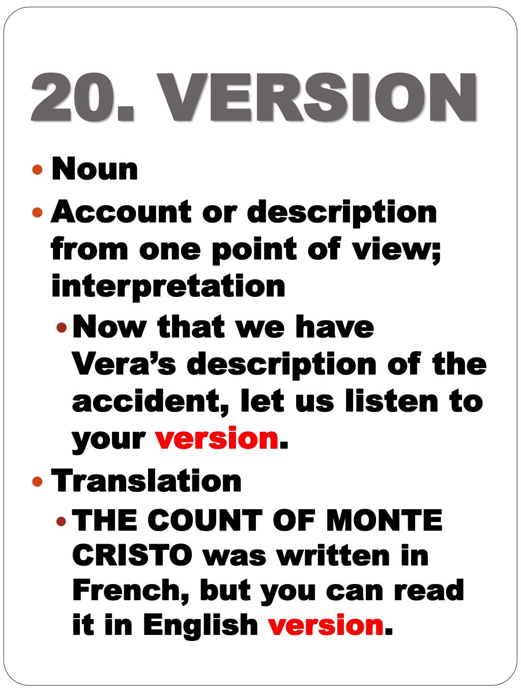 20. VERSION • Noun • Account or description from one point of view; interpretation • Now that we have Vera’s description of the accident, let us listen to your version. • Translation • THE COUNT OF MONTE CRISTO was written in French, but you can read it in English version.