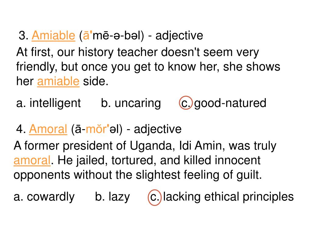 At first, our history teacher doesn't seem very friendly, but once you get to know her, she shows her amiable side. a. intelligent b. uncaring c. good-natured 3. Amiable (ā'mē-ə-bəl) - adjective A former president of Uganda, Idi Amin, was truly amoral. He jailed, tortured, and killed innocent opponents without the slightest feeling of guilt. a. cowardly b. lazy c. lacking ethical principles 4. Amoral (ā-mŏr'əl) - adjective