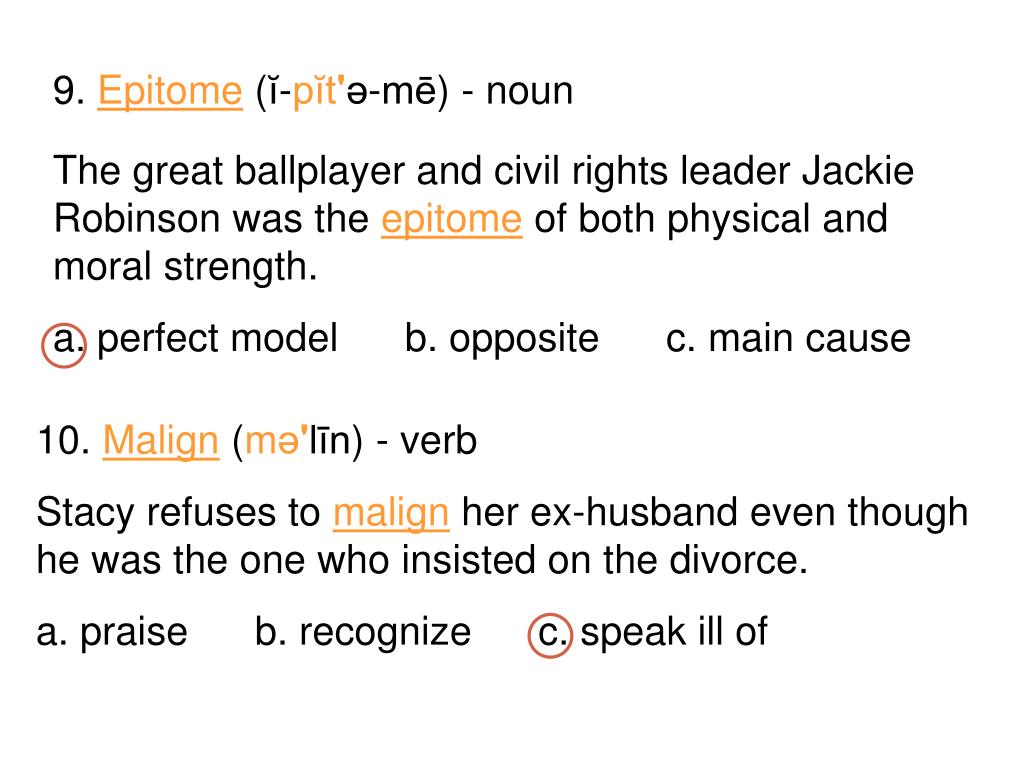 9. Epitome (ĭ-pĭt'ə-mē) - noun The great ballplayer and civil rights leader Jackie Robinson was the epitome of both physical and moral strength. a. perfect model b. opposite c. main cause Stacy refuses to malign her ex-husband even though he was the one who insisted on the divorce. a. praise b. recognize c. speak ill of 10. Malign (mə'līn) - verb
