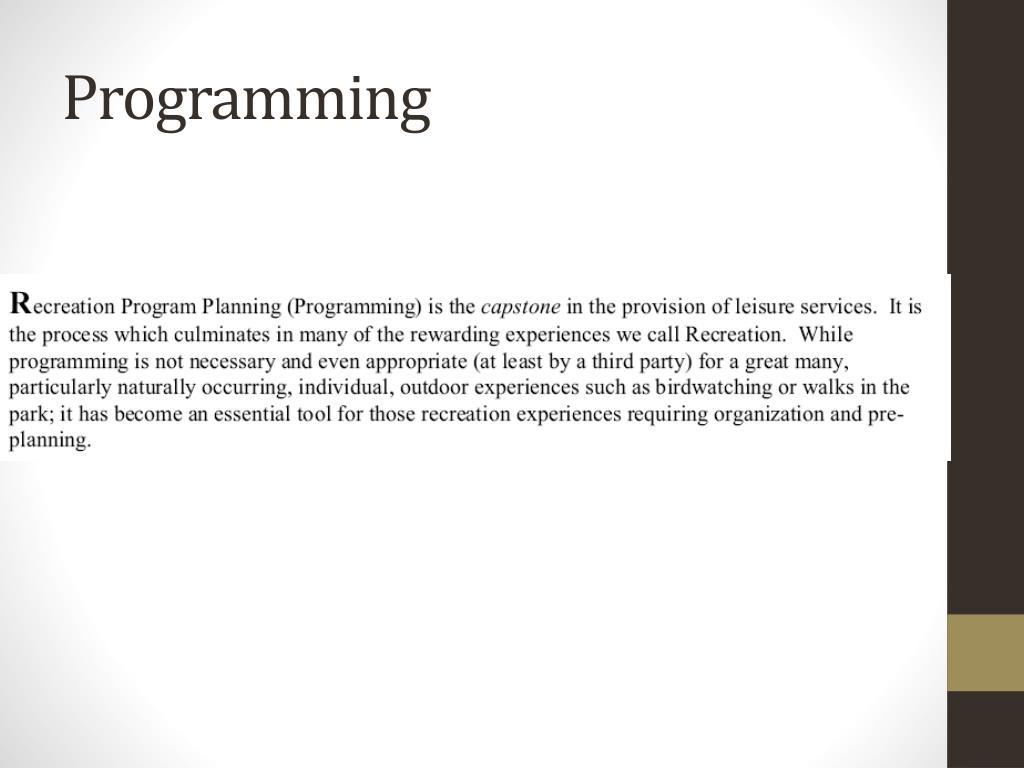 Review of Value and Benefits of Recreation Participation. Recreation is Personal There are many potential benefits. Programming. Why Recreation Programming. What happens to people as a result of recreation experiences?. Driver and Brown USFS.