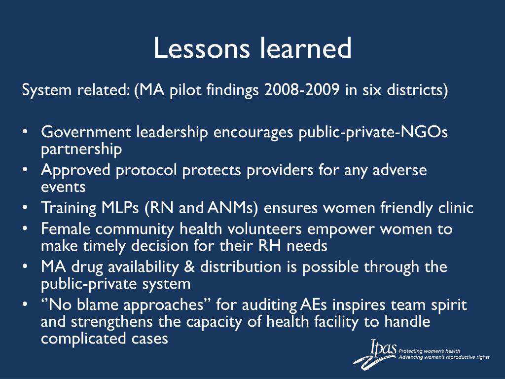 Lessons learned System related: (MA pilot findings 2008-2009 in six districts) • Government leadership encourages public-private-NGOs partnership • Approved protocol protects providers for any adverse events • Training MLPs (RN and ANMs) ensures women friendly clinic • Female community health volunteers empower women to make timely decision for their RH needs • MA drug availability & distribution is possible through the public-private system • ‘’No blame approaches’’ for auditing AEs inspires team spirit and strengthens the capacity of health facility to handle complicated cases
