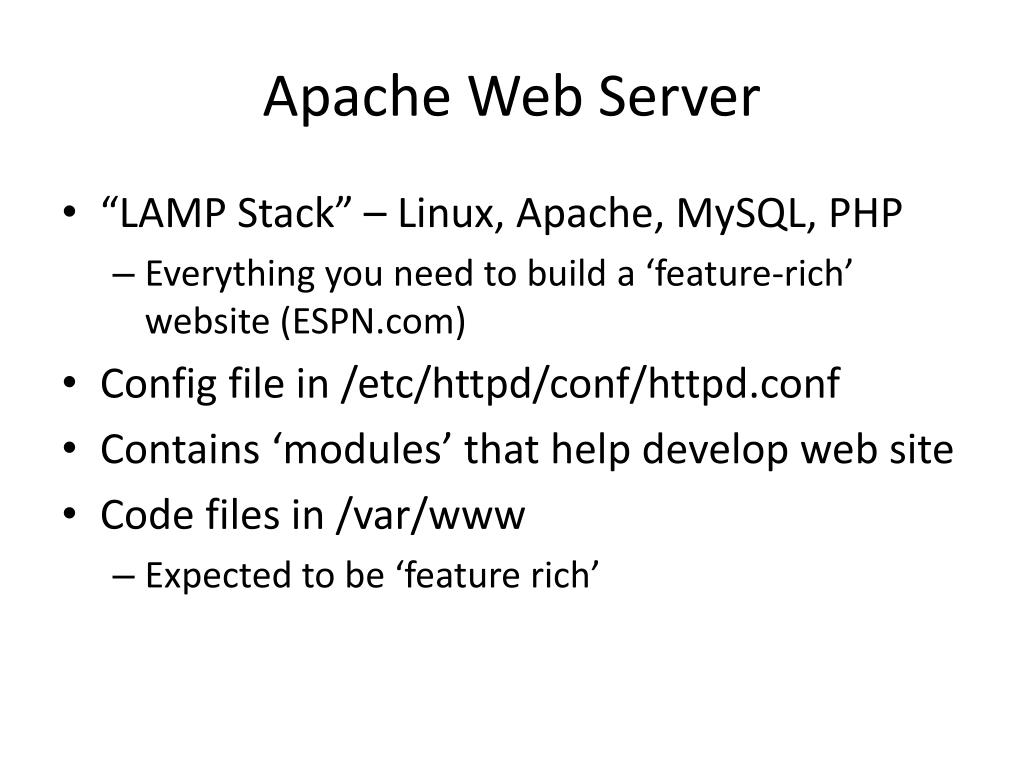 Apache Web Server • “LAMP Stack” – Linux, Apache, MySQL, PHP • Everything you need to build a ‘feature-rich’ website (ESPN.com) • Config file in /etc/httpd/conf/httpd.conf • Contains ‘modules’ that help develop web site • Code files in /var/www • Expected to be ‘feature rich’