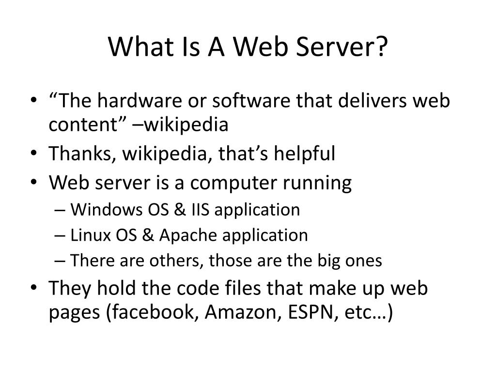 What Is A Web Server? • “The hardware or software that delivers web content” –wikipedia • Thanks, wikipedia, that’s helpful • Web server is a computer running • Windows OS & IISapplication • Linux OS & Apache application • There are others, those are the big ones • They hold the code files that make up web pages (facebook, Amazon, ESPN, etc…)