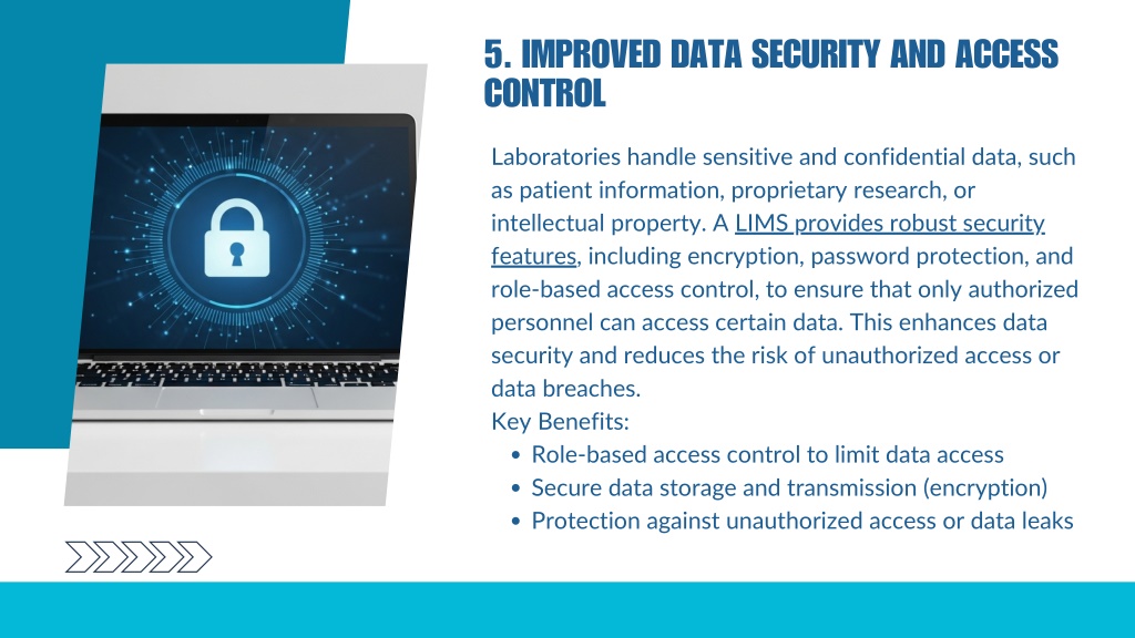 5. IMPROVED DATA SECURITY AND ACCESS CONTROL Laboratories handle sensitive and confidential data, such as patient information, proprietary research, or intellectual property. A LIMS provides robust security features, including encryption, password protection, and role-based access control, to ensure that only authorized personnel can access certain data. This enhances data security and reduces the risk of unauthorized access or data breaches. Key Benefits: Role-based access control to limit data access Secure data storage and transmission (encryption) Protection against unauthorized access or data leaks