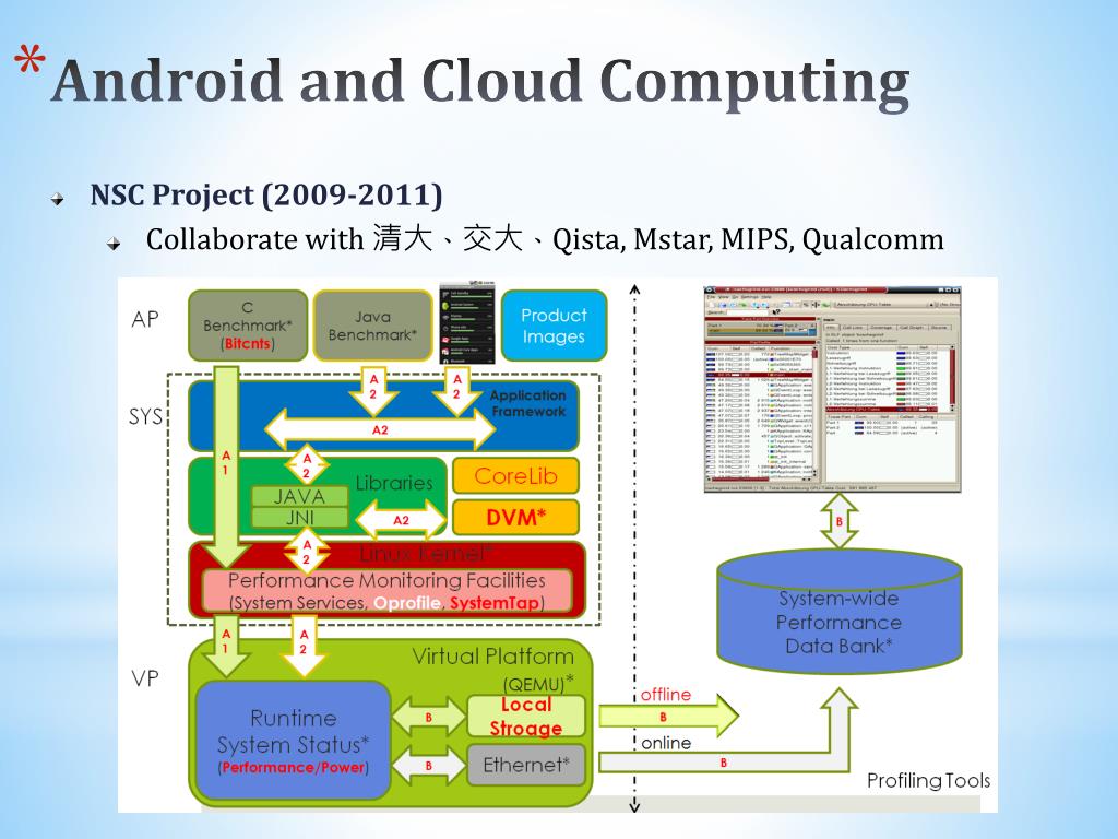 Android and Cloud Computing • NSC Project (2009-2011) • Collaborate with 清大、交大、Qista, Mstar, MIPS, Qualcomm