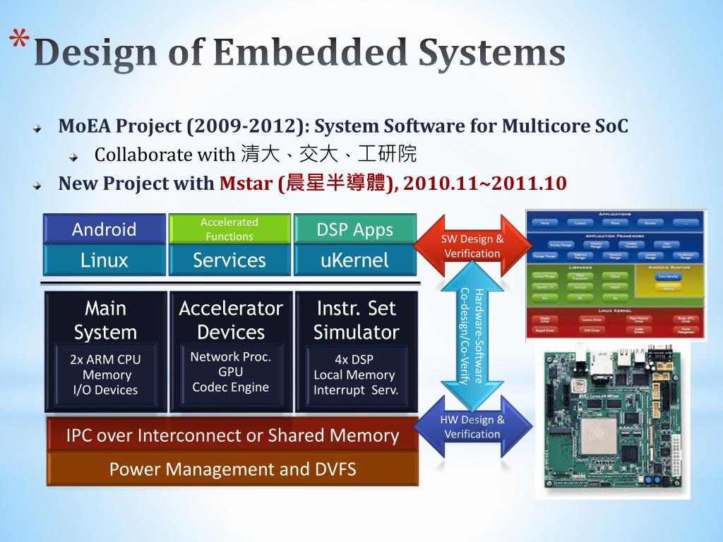 Design of Embedded Systems • MoEA Project (2009-2012): System Software for Multicore SoC • Collaborate with 清大、交大、工研院 • New Project with Mstar (晨星半導體), 2010.11~2011.10 Android Accelerated Functions DSP Apps SW Design & Verification Linux Services uKernel Instr. SetSimulator Main System (QEMU) AcceleratorDevices Hardware-Software Co-design/Co-Verify 2x ARM CPU Memory I/O Devices Network Proc.GPU Codec Engine 4x DSP Local MemoryInterrupt Serv. HW Design & Verification IPC over Interconnect or Shared Memory Power Management and DVFS