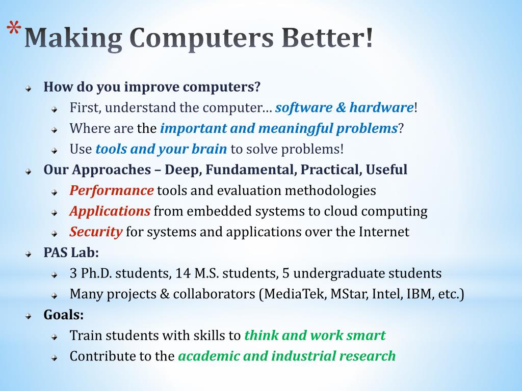 P erformance 效能 A pplications 應用 S ecurity 安全 Lab 實驗室. Prof. Shih- Hao Hung 洪士灝 Dept. of CSIE & GINM 資工網媒 [ 2011.05 ]. Making Computers Better !. How do you improve computers? First, understand the computer… software & hardware !