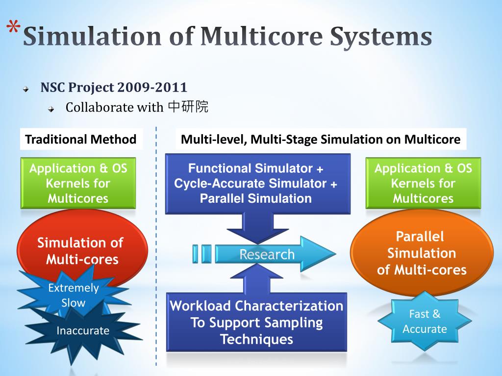 Simulation of Multicore Systems • NSC Project 2009-2011 • Collaborate with 中研院 Traditional Method Multi-level, Multi-Stage Simulation on Multicore Functional Simulator + Cycle-Accurate Simulator + Parallel Simulation Application & OS Kernels for Multicores Application & OS Kernels for Multicores Simulation of Multi-cores Parallel Simulation of Multi-cores Research Extremely Slow Workload Characterization To Support Sampling Techniques Fast &Accurate Inaccurate