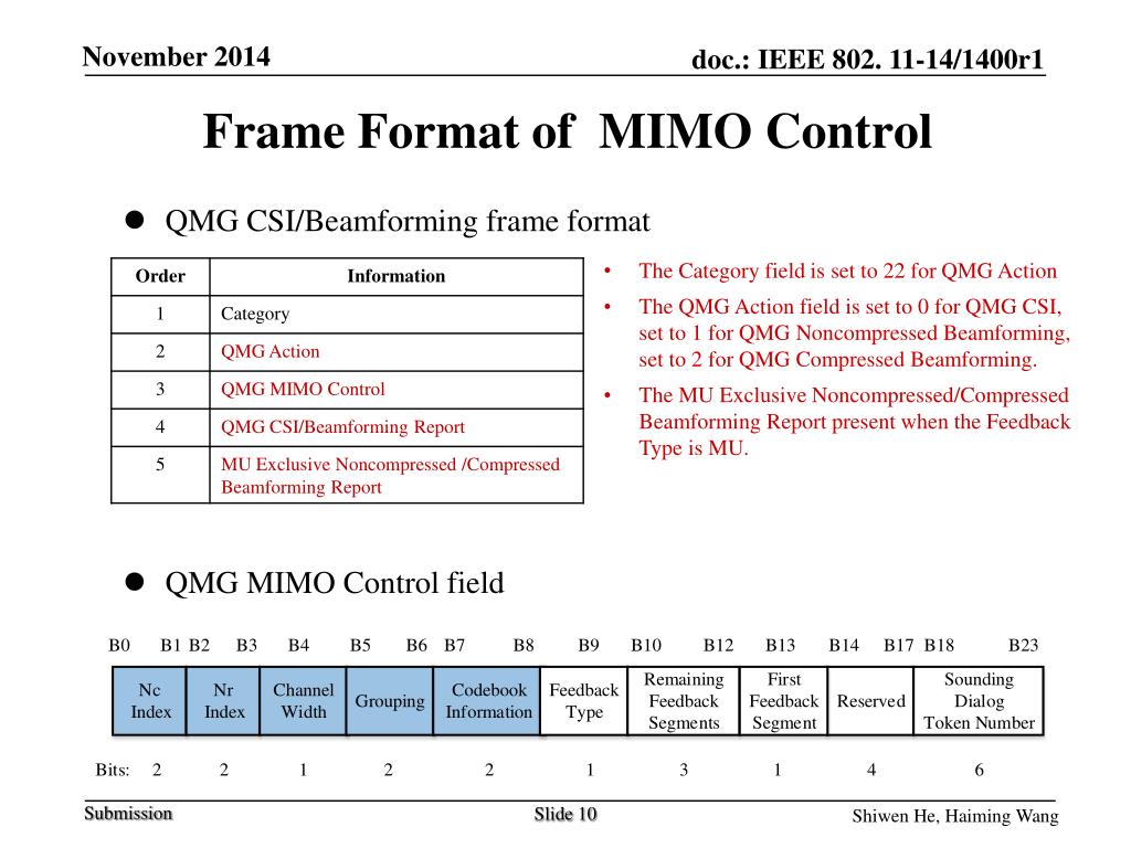 Frame Format of MIMO Control • QMG CSI/Beamforming frame format • QMG MIMO Control field • The Category field is set to 22 for QMG Action • The QMG Action field is set to 0 for QMG CSI, set to 1 for QMG Noncompressed Beamforming, set to 2 for QMG Compressed Beamforming. • The MU Exclusive Noncompressed/Compressed Beamforming Report present when the Feedback Type is MU.
