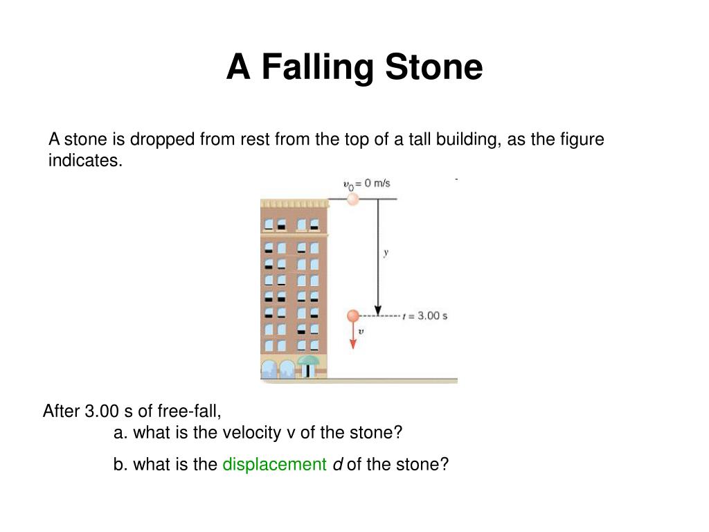 A Falling Stone A stone is dropped from rest from the top of a tall building, as the figure indicates. After 3.00 s of free-fall, a. what is the velocity v of the stone? b. what is the displacementd of the stone?