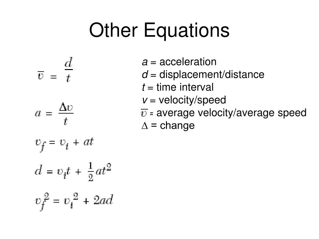 Other Equations a = acceleration d = displacement/distance t = time interval v = velocity/speed = average velocity/average speed ∆ = change