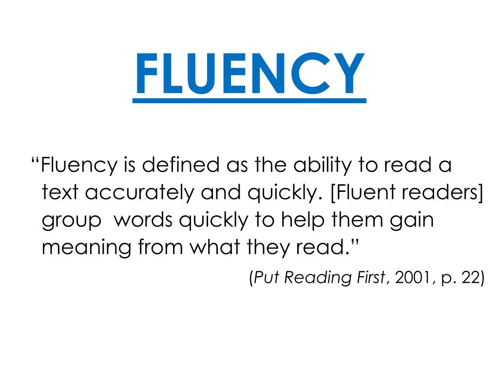 FLUENCY “Fluency is defined as the ability to read a text accurately and quickly. [Fluent readers] group words quickly to help them gain meaning from what they read.” (Put Reading First, 2001, p. 22)