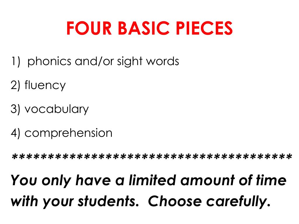 FOUR BASIC PIECES • phonics and/or sight words 2) fluency 3) vocabulary 4) comprehension *************************************** You only have a limited amount of time with your students. Choose carefully.