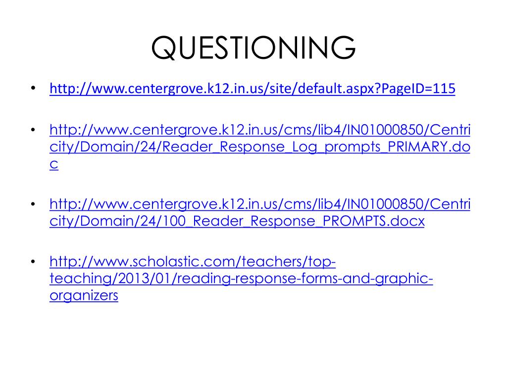 QUESTIONING • http://www.centergrove.k12.in.us/site/default.aspx?PageID=115 • http://www.centergrove.k12.in.us/cms/lib4/IN01000850/Centricity/Domain/24/Reader_Response_Log_prompts_PRIMARY.doc • http://www.centergrove.k12.in.us/cms/lib4/IN01000850/Centricity/Domain/24/100_Reader_Response_PROMPTS.docx • http://www.scholastic.com/teachers/top-teaching/2013/01/reading-response-forms-and-graphic-organizers
