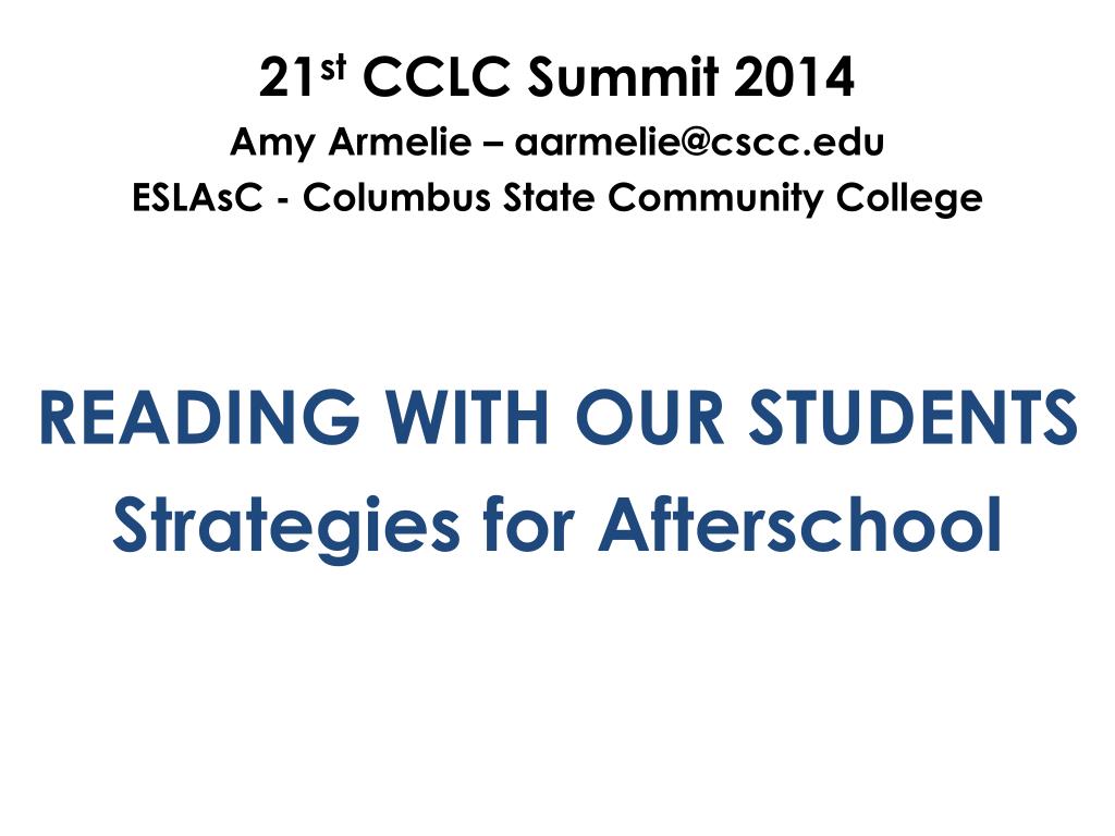 21st CCLC Summit 2014 Amy Armelie – aarmelie@cscc.edu ESLAsC - Columbus State Community College READING WITH OUR STUDENTS Strategies for Afterschool