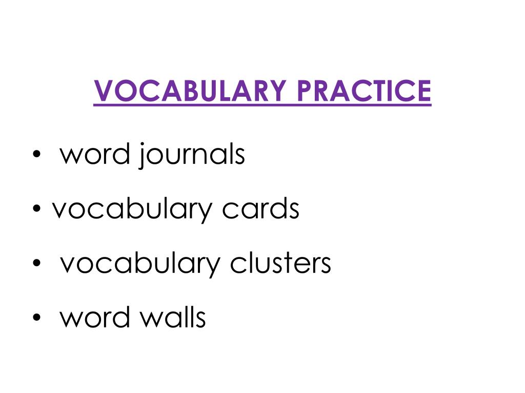 VOCABULARY PRACTICE • word journals • vocabulary cards • vocabulary clusters • word walls