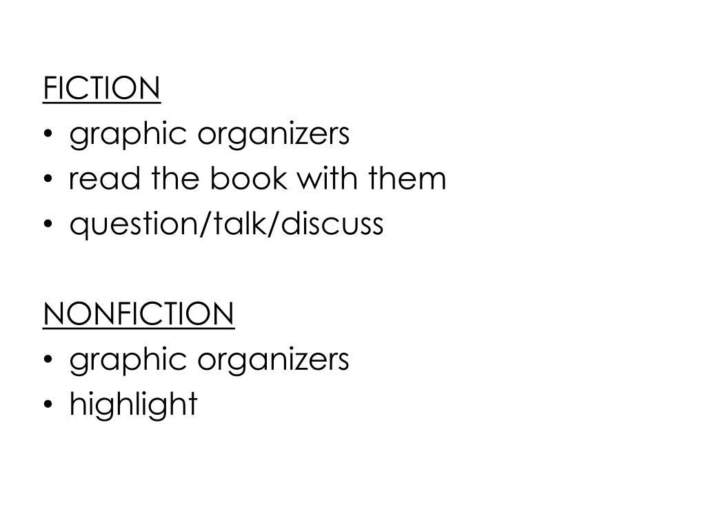 FICTION • graphic organizers • read the book with them • question/talk/discuss NONFICTION • graphic organizers • highlight
