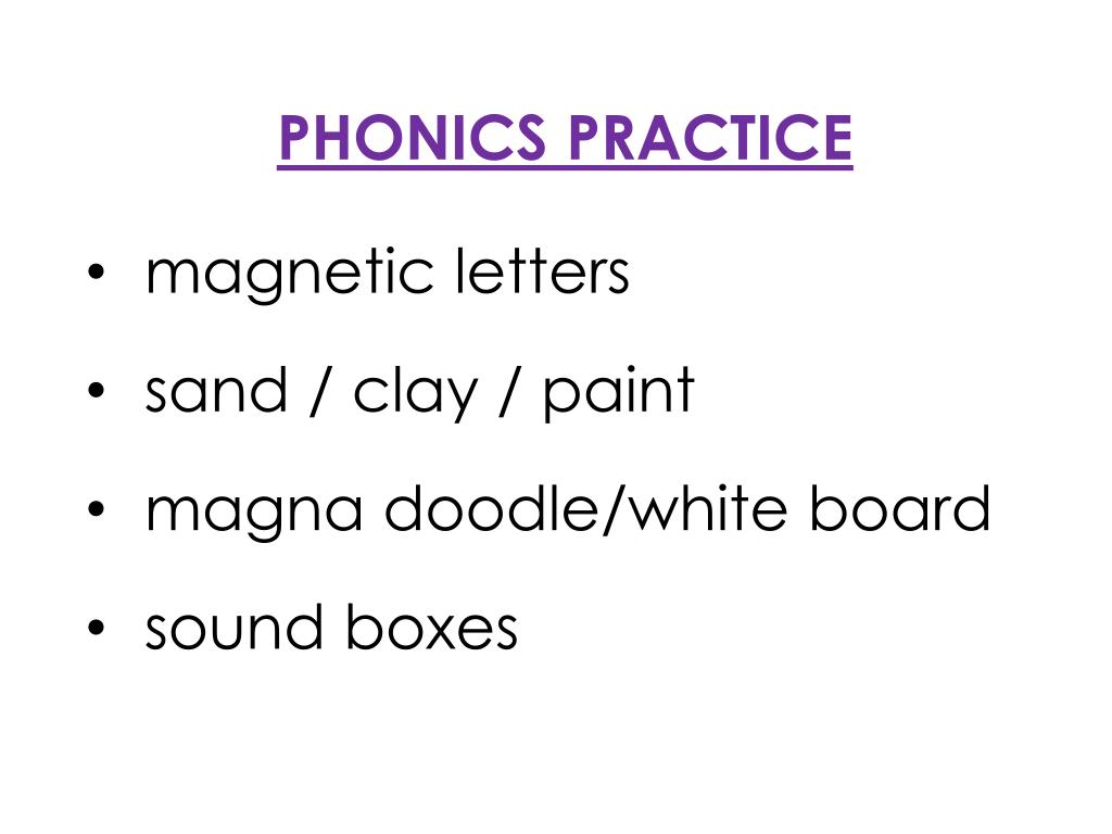 PHONICS PRACTICE • magnetic letters • sand / clay / paint • magna doodle/white board • sound boxes