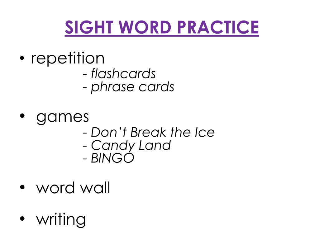 SIGHT WORD PRACTICE • repetition - flashcards - phrase cards • games - Don’t Break the Ice - Candy Land - BINGO • word wall • writing