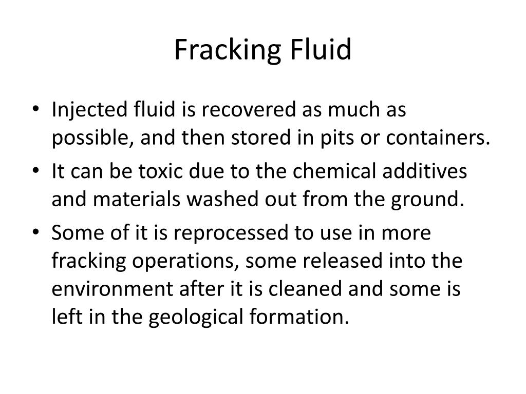 Fracking Fluid • Injected fluid is recovered as much as possible, and then stored in pits or containers. • It can be toxic due to the chemical additives and materials washed out from the ground. • Some of it is reprocessed to use in more fracking operations, some released into the environment after it is cleaned and some is left in the geological formation.