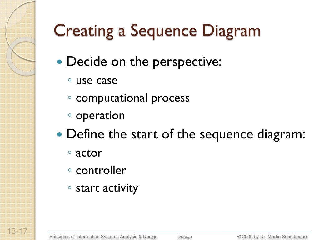 Creating a Sequence Diagram • Decide on the perspective: • use case • computational process • operation • Define the start of the sequence diagram: • actor • controller • start activity