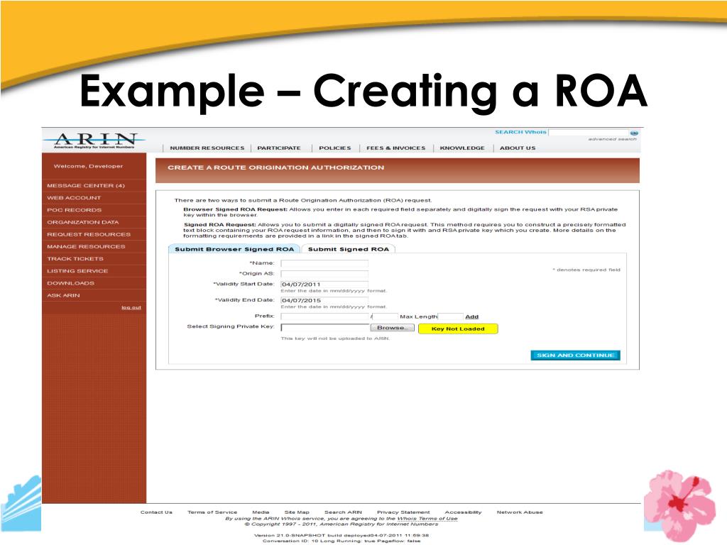 Changes Underway In-browser ROA request signing via AJAX. ARIN Online Message driven engine which delegates to the HSM. Database Persistence RPKI Engine Minor changes. HSM Custom programming on IBM 4764’s to enable all DER encoding and crypto. HSM coding is in C as extensions to IBM CCA. Libtasn1 used for DER coding.