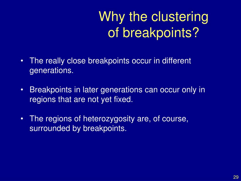 Why the clusteringof breakpoints? • The really close breakpoints occur in different generations. • Breakpoints in later generations can occur only in regions that are not yet fixed. • The regions of heterozygosity are, of course, surrounded by breakpoints.