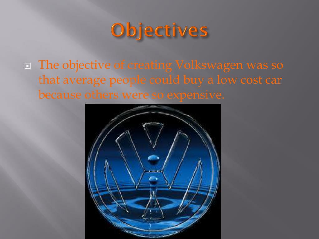 Objectives • The objective of creating Volkswagen was so that average people could buy a low cost car because others were so expensive.