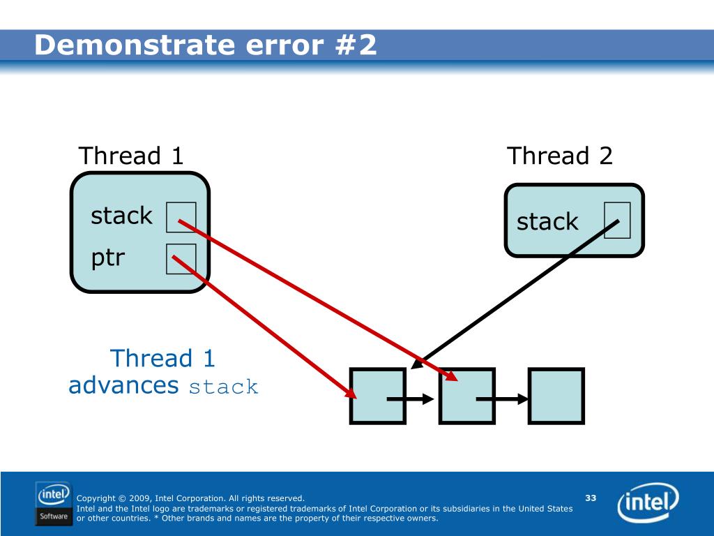 stack Demonstrate error #2 Thread 1 Thread 2 stack ptr Thread 1 advances stack