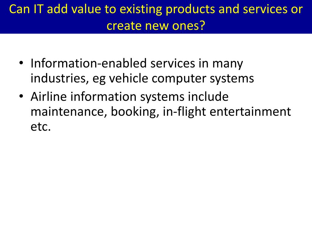 Can IT add value to existing products and services or create new ones? • Information-enabled services in many industries, eg vehicle computer systems • Airline information systems include maintenance, booking, in-flight entertainment etc.