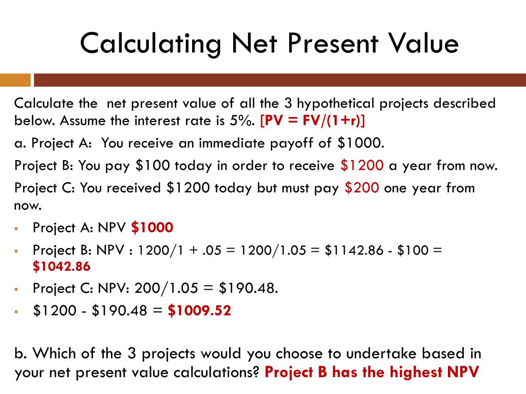 Calculating Net Present Value Calculate the net present value of all the 3 hypothetical projects described below. Assume the interest rate is 5%.[PV = FV/(1+r)] a. Project A: You receive an immediate payoff of $1000. Project B: You pay $100 today in order to receive $1200 a year from now. Project C: You received $1200 today but must pay $200 one year from now. b. Which of the 3 projects would you choose to undertake based in your net present value calculations?
