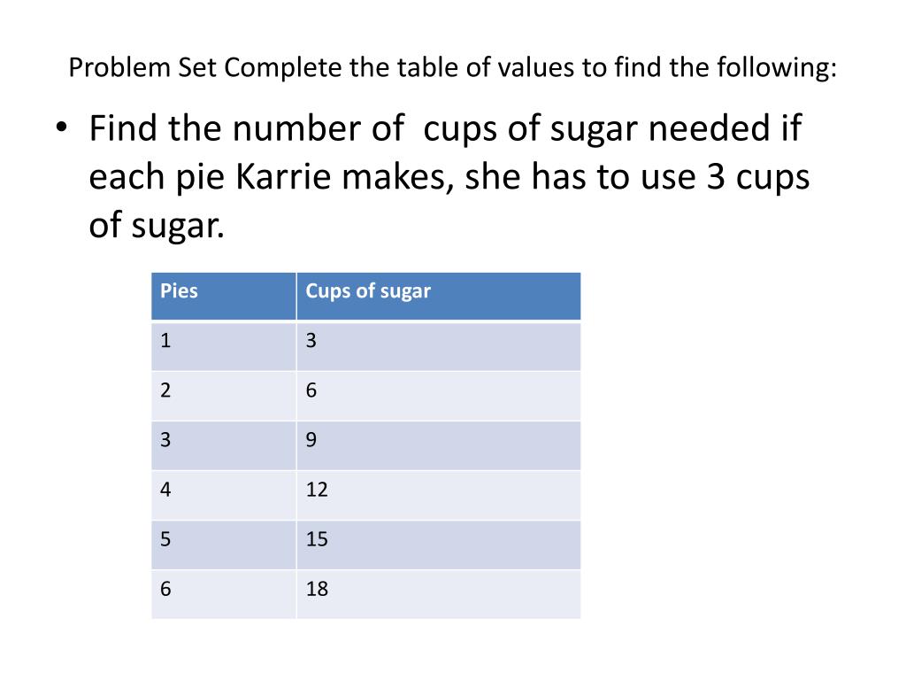 Problem Set Complete the table of values to find the following: • Find the number of cups of sugar needed if each pie Karrie makes, she has to use 3 cups of sugar.