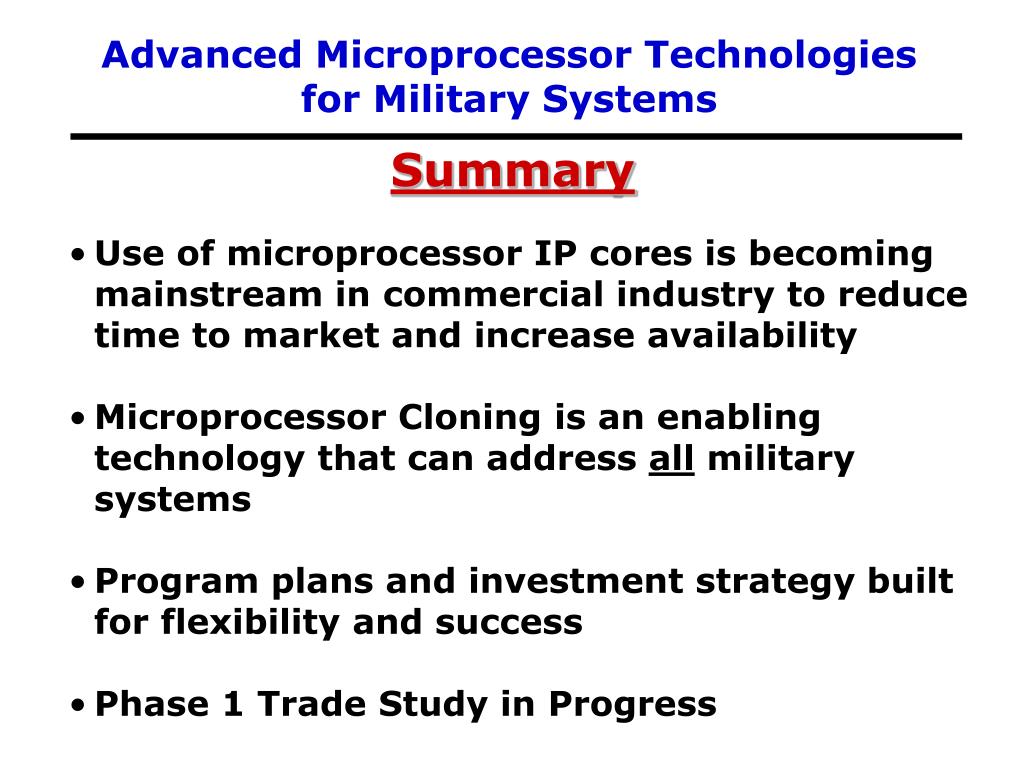 Advanced Microprocessor Technologiesfor Military Systems Summary • Use of microprocessor IP cores is becoming mainstream in commercial industry to reduce time to market and increase availability • Microprocessor Cloning is an enabling technology that can address all military systems • Program plans and investment strategy built for flexibility and success • Phase 1 Trade Study in Progress