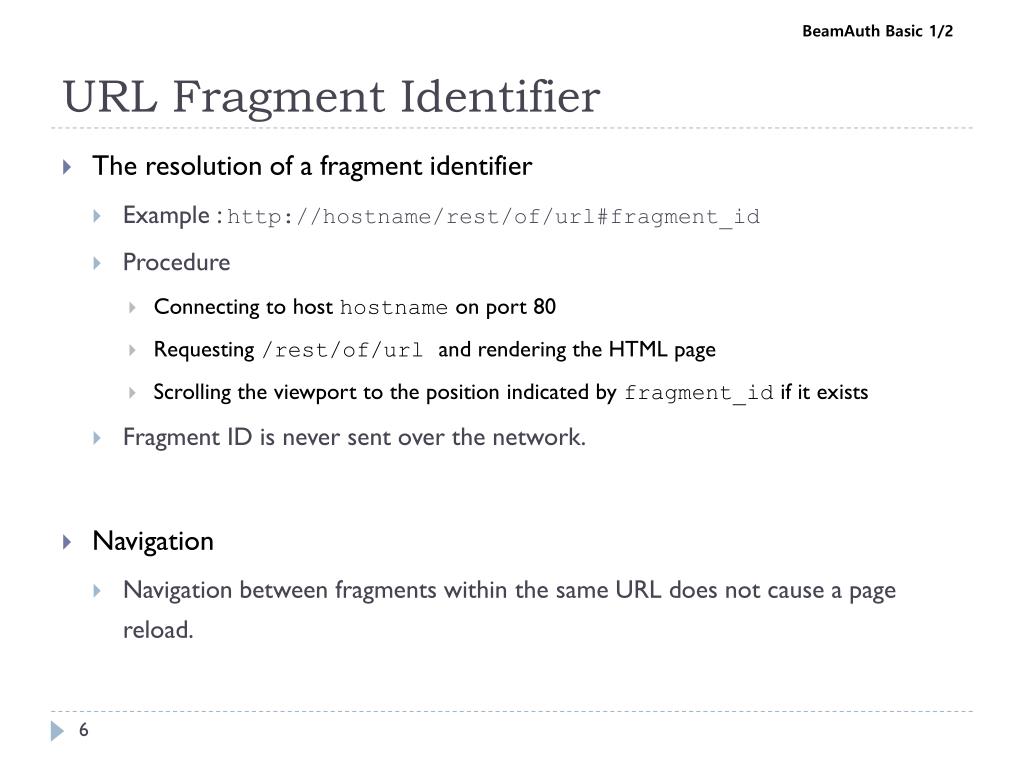 BeamAuth Basic 1/2 URL Fragment Identifier • The resolution of a fragment identifier • Example : http://hostname/rest/of/url#fragment_id • Procedure • Connecting to host hostname on port 80 • Requesting /rest/of/urland rendering the HTML page • Scrolling the viewport to the position indicated by fragment_id if it exists • Fragment ID is never sent over the network. • Navigation • Navigation between fragments within the same URL does not cause a page reload.