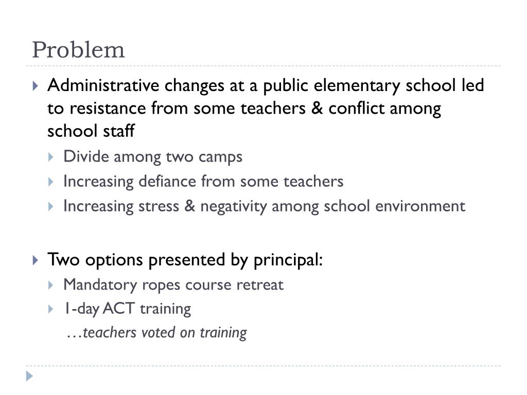 Problem • Administrative changes at a public elementary school led to resistance from some teachers & conflict among school staff • Divide among two camps • Increasing defiance from some teachers • Increasing stress & negativity among school environment • Two options presented by principal: • Mandatory ropes course retreat • 1-day ACT training …teachers voted on training
