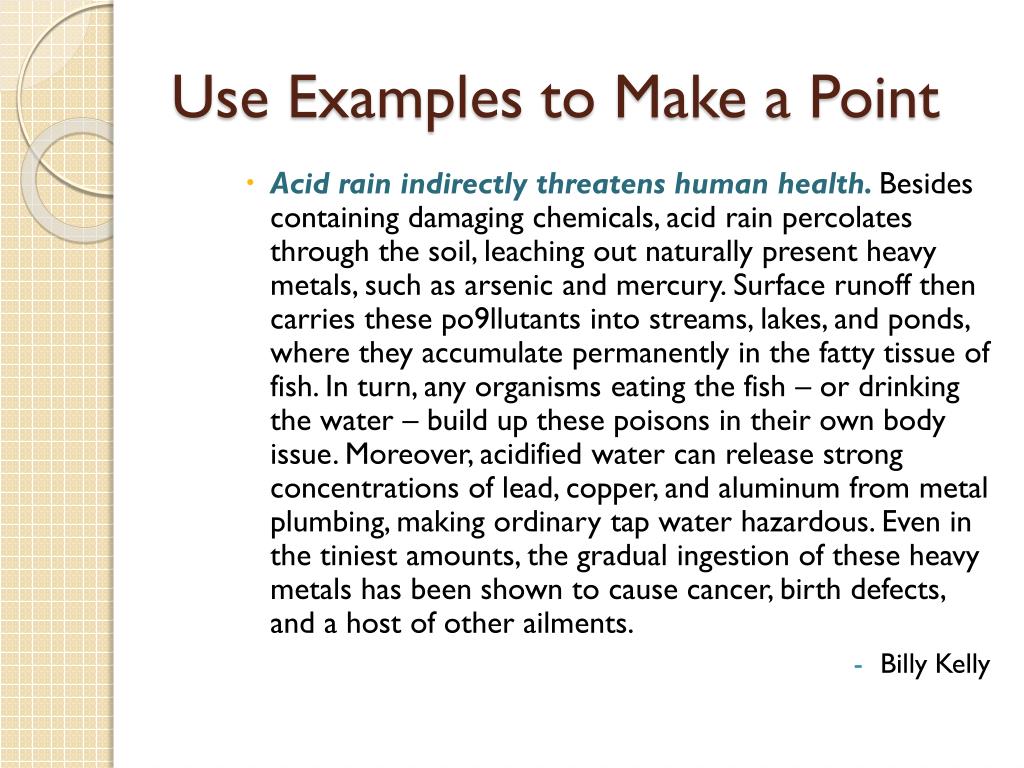 Use Examples to Make a Point • Acid rain indirectly threatens human health. Besides containing damaging chemicals, acid rain percolates through the soil, leaching out naturally present heavy metals, such as arsenic and mercury. Surface runoff then carries these po9llutants into streams, lakes, and ponds, where they accumulate permanently in the fatty tissue of fish. In turn, any organisms eating the fish – or drinking the water – build up these poisons in their own body issue. Moreover, acidified water can release strong concentrations of lead, copper, and aluminum from metal plumbing, making ordinary tap water hazardous. Even in the tiniest amounts, the gradual ingestion of these heavy metals has been shown to cause cancer, birth defects, and a host of other ailments. • Billy Kelly
