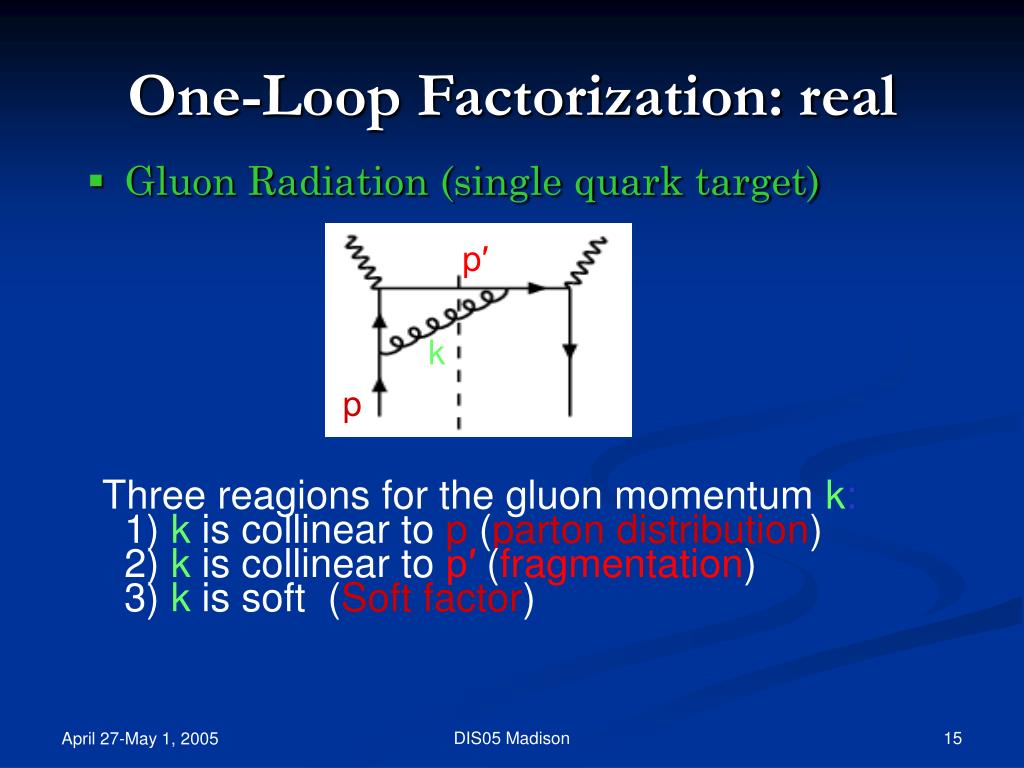 Gluon Radiation (single quark target) One-Loop Factorization: real p′ k p Three reagions for the gluon momentum k: 1) k is collinear to p (parton distribution) 2) k is collinear to p′ (fragmentation) 3) k is soft (Soft factor) DIS05 Madison