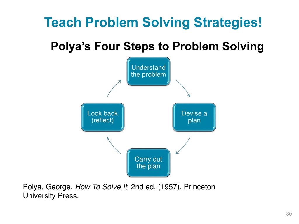 Teach Problem Solving Strategies! Polya’s Four Steps to Problem Solving Polya, George. How To Solve It, 2nd ed. (1957). Princeton University Press.