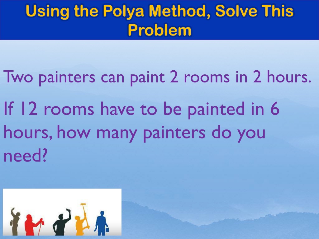 Using the Polya Method, Solve This Problem Two painters can paint 2 rooms in 2 hours. If 12 rooms have to be painted in 6 hours, how many painters do you need?
