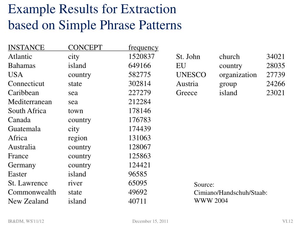 Example Results for Extractionbased on Simple Phrase Patterns INSTANCE CONCEPT frequency Atlantic city 1520837 Bahamas island 649166 USA country 582775 Connecticut state 302814 Caribbean sea 227279 Mediterranean sea 212284 South Africa town 178146 Canada country 176783 Guatemala city 174439 Africa region 131063 Australia country 128067 France country 125863 Germany country 124421 Easter island 96585 St. Lawrence river 65095 Commonwealth state 49692 New Zealand island 40711 St. John church 34021 EU country 28035 UNESCO organization 27739 Austria group 24266 Greece island 23021 Source: Cimiano/Handschuh/Staab: WWW 2004 IR&DM, WS'11/12