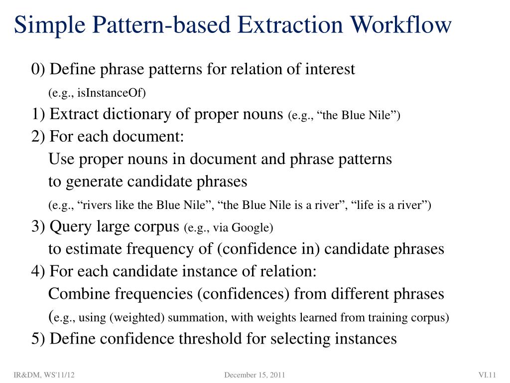Simple Pattern-based Extraction Workflow 0) Define phrase patterns for relation of interest (e.g., isInstanceOf) 1) Extract dictionary of proper nouns (e.g., “the Blue Nile”) 2) For each document: Use proper nouns in document and phrase patterns to generate candidate phrases (e.g., “rivers like the Blue Nile”, “the Blue Nile is a river”, “life is a river”) 3) Query large corpus (e.g., via Google) to estimate frequency of (confidence in) candidate phrases 4) For each candidate instance of relation: Combine frequencies (confidences) from different phrases (e.g., using (weighted) summation, with weights learned from training corpus) 5) Define confidence threshold for selecting instances IR&DM, WS'11/12
