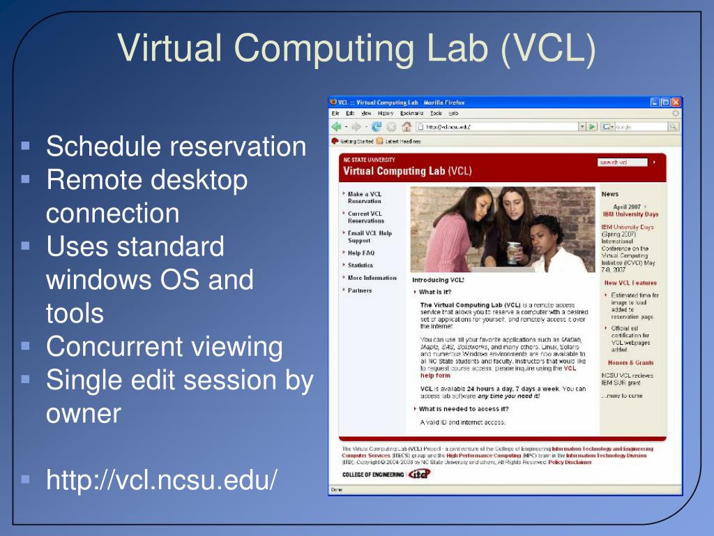 Virtual Computing Lab (VCL) • Schedule reservation • Remote desktop connection • Uses standard windows OS and tools • Concurrent viewing • Single edit session by owner • http://vcl.ncsu.edu/