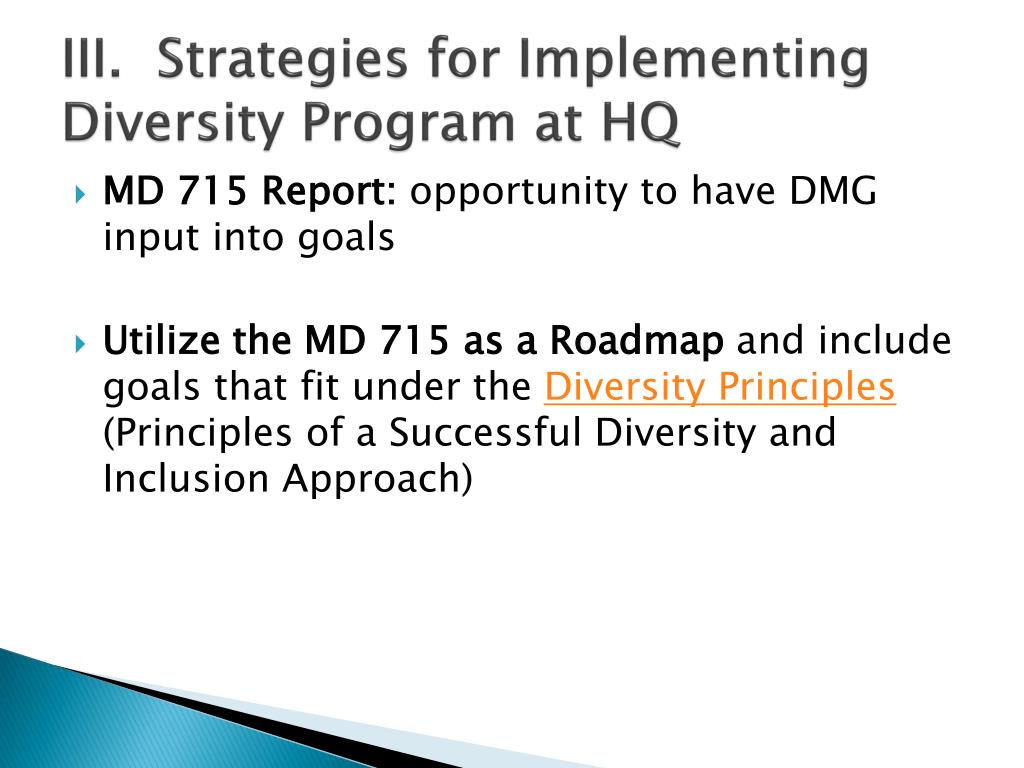 III. Strategies for Implementing Diversity Program at HQ • MD 715 Report: opportunity to have DMG input into goals • Utilize the MD 715 as a Roadmap and include goals that fit under the Diversity Principles (Principles of a Successful Diversity and Inclusion Approach)