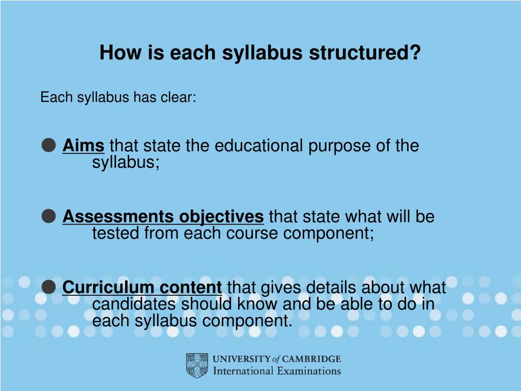 How is each syllabus structured? Each syllabus has clear: ●Aims that state the educational purpose of the syllabus; ●Assessments objectives that state what will be tested from each course component; ●Curriculum content that gives details about what candidates should know and be able to do in each syllabus component.