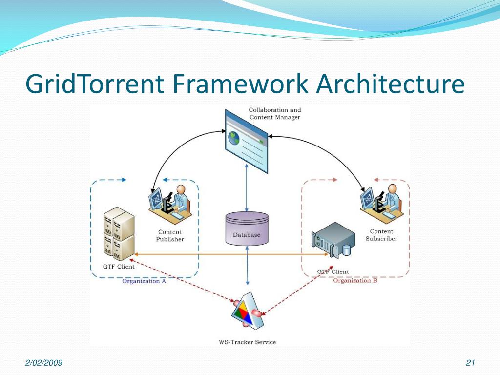 GridTorrent Client • Modular architecture • Provides extensibility and flexibility • Built-on P2P file sharing protocol • Enables to utilize idle resources efficiently • Provides adequate security • Authentication • Authorization • Utilizes regular and parallel stream connection (othertransferring mechanism could be used)