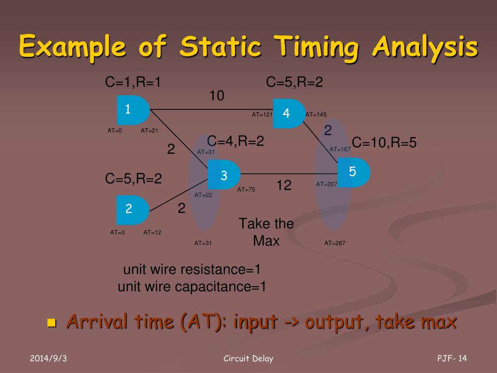 Example of Static Timing Analysis • Arrival time (AT): input -> output, take max 1 4 5 3 2 Circuit Delay