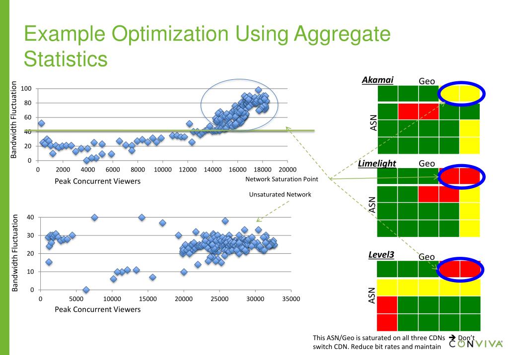 Example Optimization Using Aggregate Statistics Akamai Geo Bandwidth Fluctuation ASN Geo Limelight Network Saturation Point Peak Concurrent Viewers Unsaturated Network ASN Bandwidth Fluctuation Level3 Geo ASN Peak Concurrent Viewers This ASN/Geo is saturated on all three CDNs Don’t switch CDN. Reduce bit rates and maintain