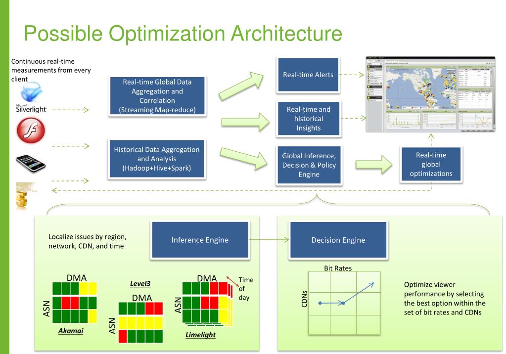 Possible Optimization Architecture Continuous real-time measurements from every client Real-time Alerts Real-time Global Data Aggregation and Correlation (Streaming Map-reduce) Real-time and historical Insights Historical Data Aggregation and Analysis (Hadoop+Hive+Spark) Global Inference, Decision & Policy Engine Real-time global optimizations Inference Engine Decision Engine Localize issues by region, network, CDN, and time DMA DMA Time of day Level3 Optimize viewer performance by selecting the best option within the set of bit rates and CDNs DMA Bit Rates ASN ASN ASN Akamai Limelight CDNs